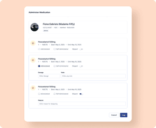 Our design focused on clarity, accessibility, and operational efficiency, enabling healthcare professionals to perform key tasks, such as medication logging, reporting, and care assessments.